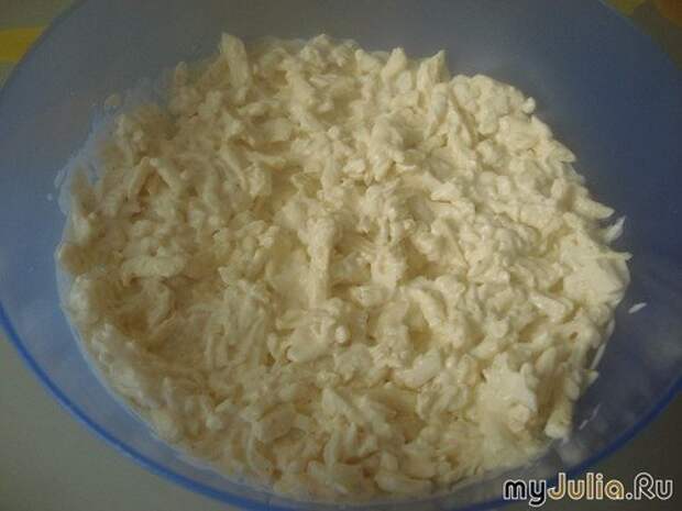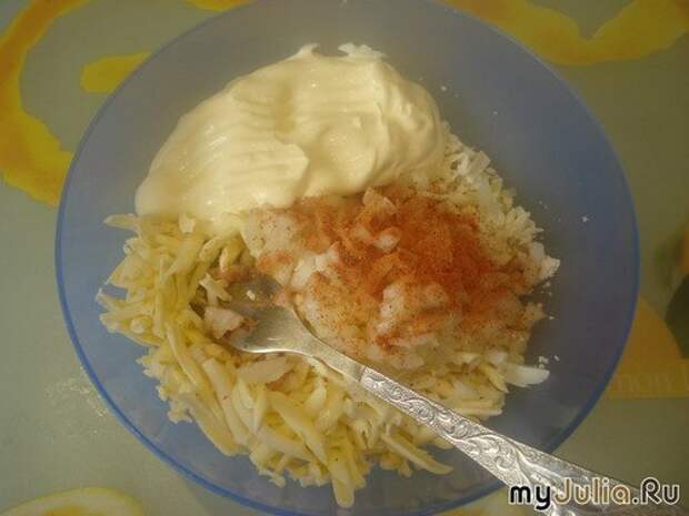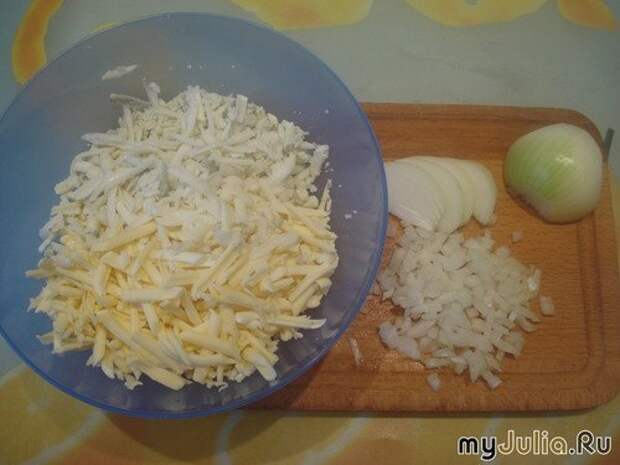 Яйца и сырки натрите на крупной тёрке, лук нарежьте мелкими кубиками.