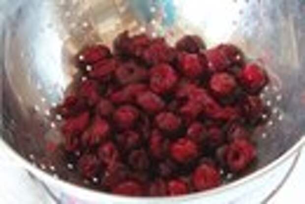1. Сперва приготовим вишню. Поместив ее в глубокую миску, разморозим в микроволновке. Размороженные ягоды не забудем переложить в дуршлаг или что-то подобное, чтобы стекла лишняя жидкость.