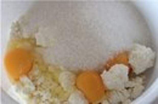 2.В общую ёмкость для теста выкладываем творог, сахар и яйца и тщательно разминаем вилкой, перемешивая.