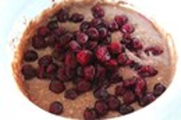 6. В последнюю очередь выкладываем в емкость с тестом размороженную вишню и аккуратно перемешиваем, стараясь не повредить ягоды.