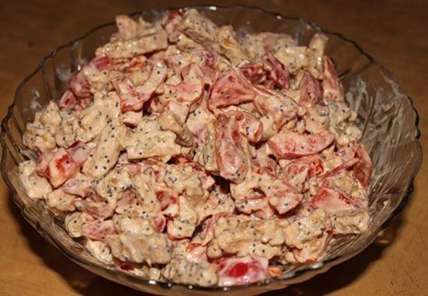 В миске смешиваем:сухарики, колбасу, сыр, помидоры, чеснок на чеснокодавку, мак и майонез. Посолим по вкусу и наслаждаемся! Салат не стекает т. к. сухарики впитывают помидорный сок. Кому нравится похрустеть-кушает сразу, а кому нравятся размоченные сухарики-ждём пару часов! Ну очень вкусно!!! Приятного аппетита!