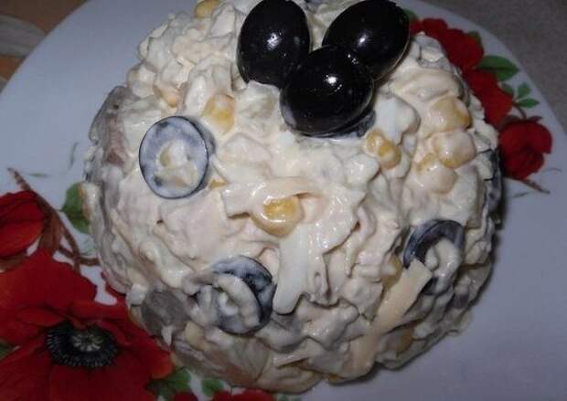 Картофель и яйца отварить. Нарезать кубиками. Шампиньоны нарезать тонкими пластинами. Сыр натереть на крупной терке. Ананасы и куриное филе нарезать кубиками. Маслины порезать колечками. Добавить кукурузу и заправить майонезом. Салат готов.