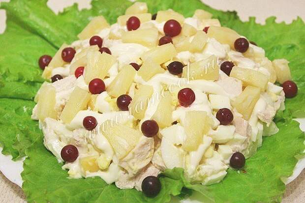 Этот салат называют дамским, поскольку он сочетает курицу и сладкий ананас. Салат очень нежный, сочный и вкусный. Его очень просто приготовить.