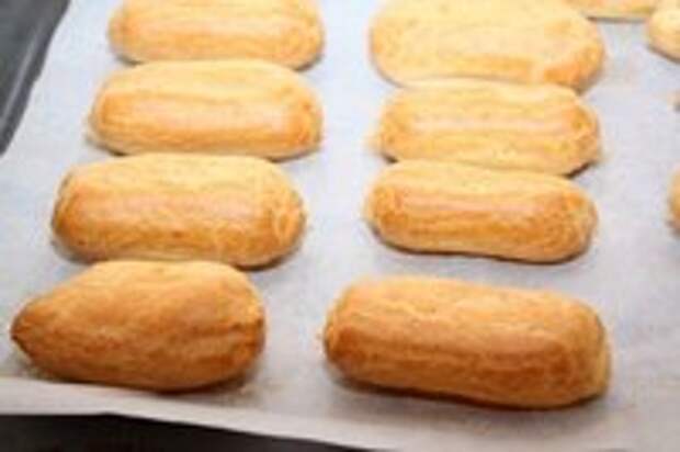 Выпекайте в разогретой до 200 градусов духовке около 30 минут. Эклеры должны хорошо подняться. После выключения духовки оставьте их внутри на 10-15 минут, чтобы они не осели.