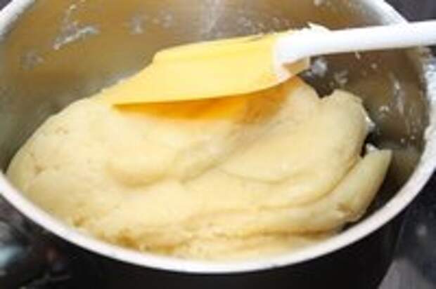 250 мл воды вскипятить, добавить масло, соль и еще раз довести до кипения. Просеять в кастрюлю с водой муку и перемешать. Должно получиться однородное плотное тесто, которое очень легко отстает от стенок кастрюли.