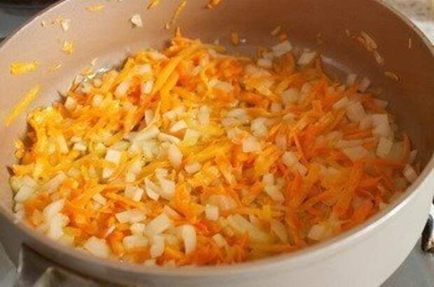 Натертую на крупной терке морковь и мелко нарезанный лук зажариваем на растительном масле.