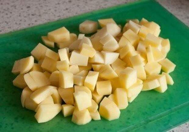 Картошку нарезаем как кубиками и засыпаем в бульон.