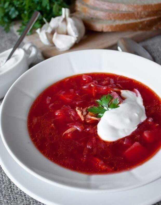 Борщ подаем со сметаной и, по желанию, с чесноком.
