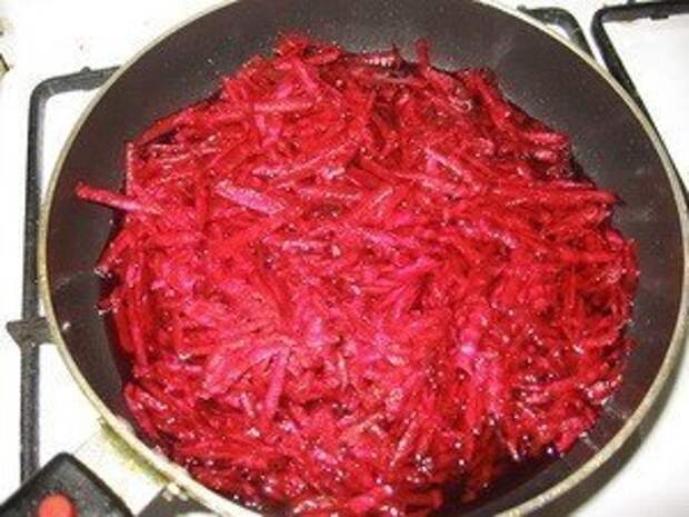 Пока варится картошка, трем на крупной терке или нарезаем соломкой свеклу. Кладем в сотейник, заливаем наполовину водой и тушим в течение 10 минут.